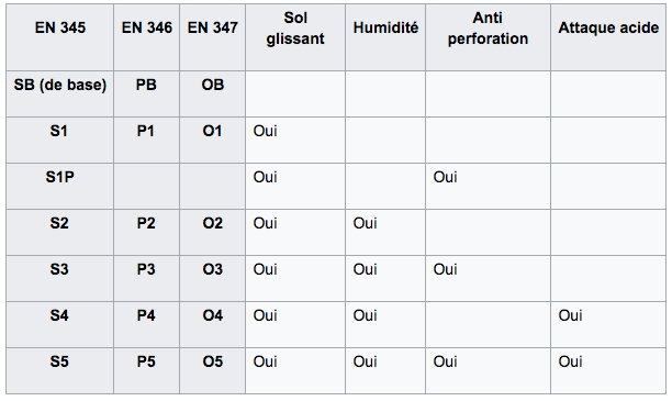 Les caractéristiques des diverses chaussures de sécurité sont codifiées comme suit